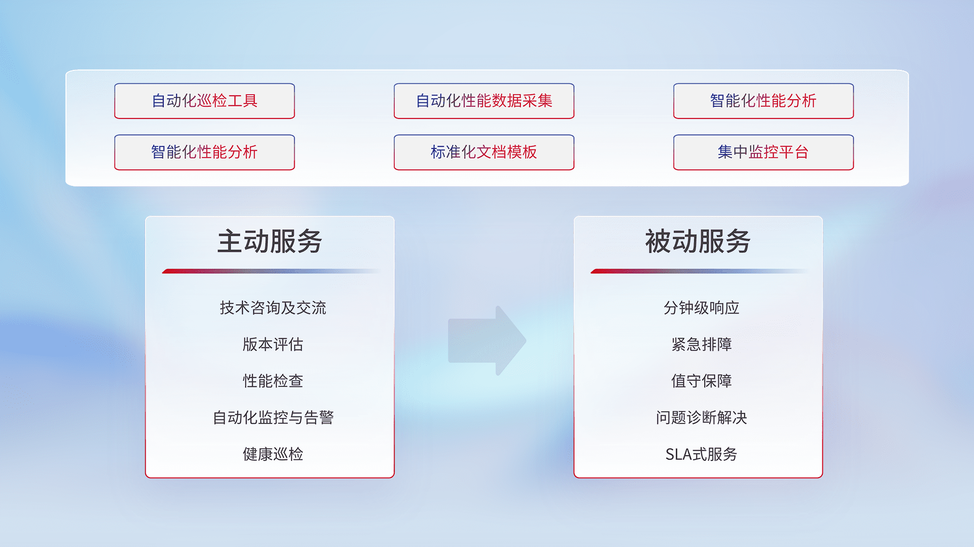智能化工具和标准化文档,,,保障服务质量,,,,提供主动服务(包含技术咨询、、、、版本评估、、、、性能检查、、、自动化监控与告警、、、、健康巡检)和被动服务包含(分钟级响应、、、紧急排障、、值守保障、、、问题诊断解决、、、SLA服务)。。。。